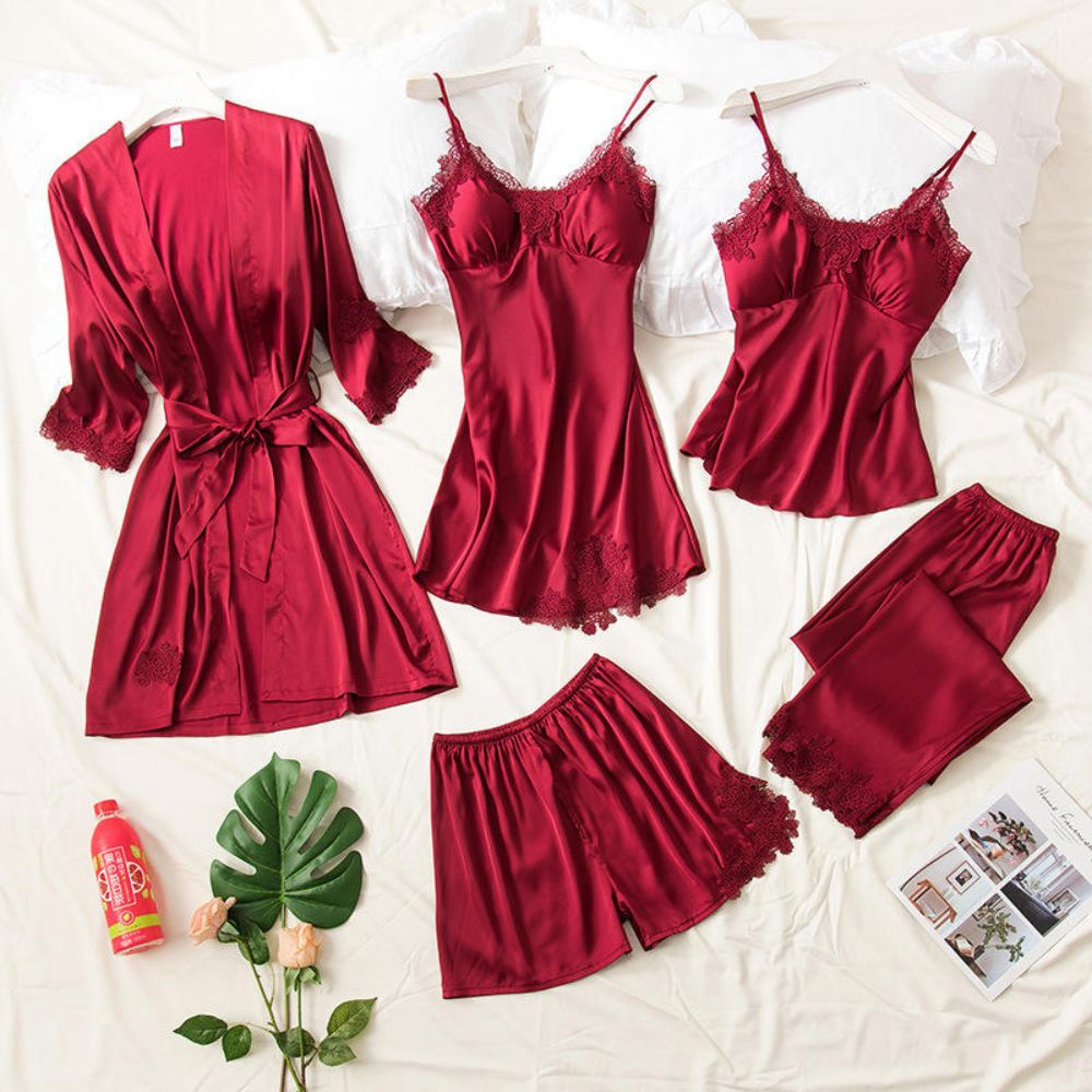 5 pcs maroon silk night suit for women Pakistan premium satin nightwear set with robe and lace design