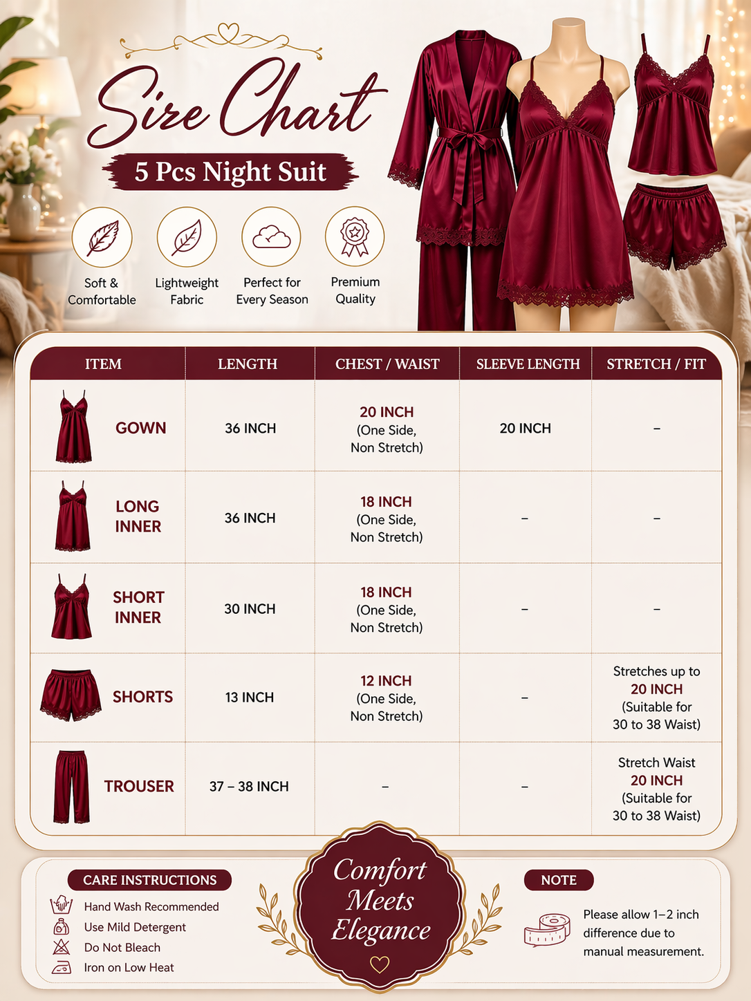 5 pcs maroon silk night suit size chart for women Pakistan with measurements